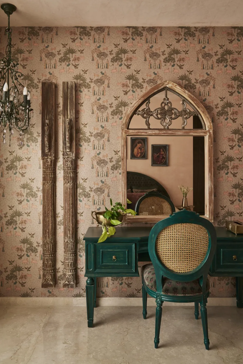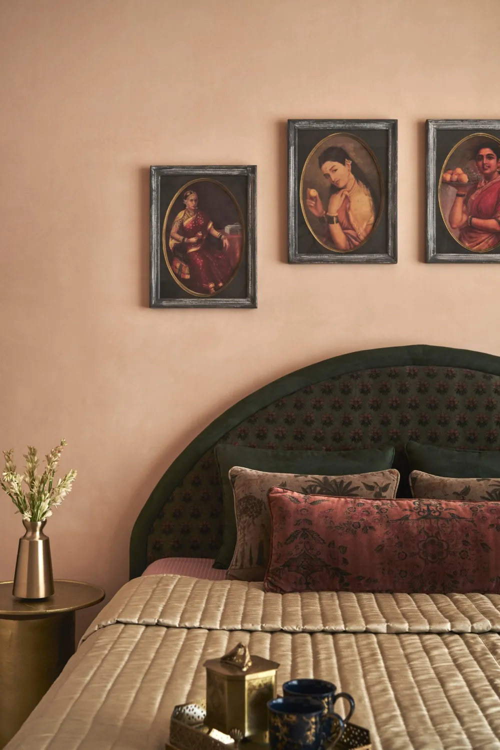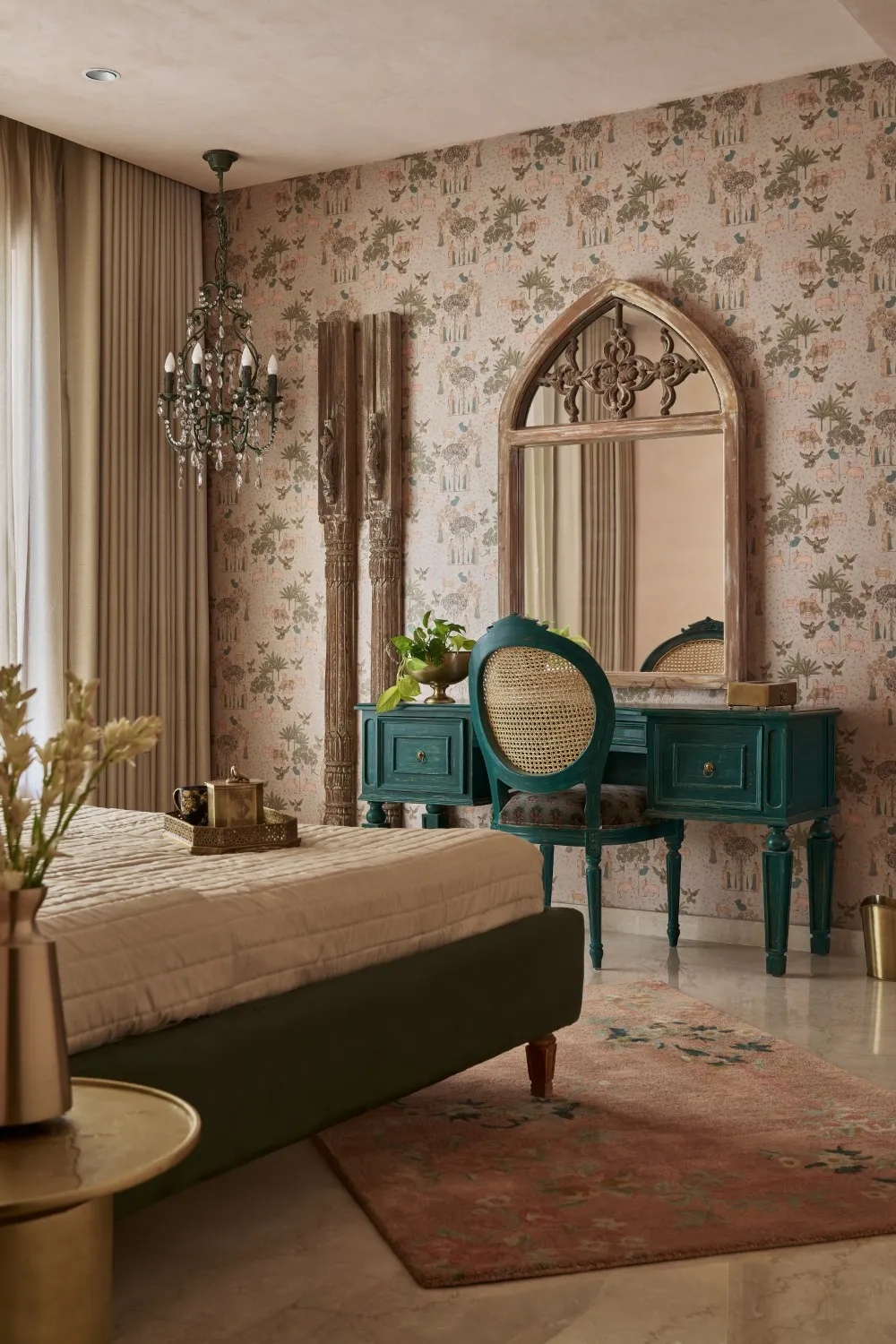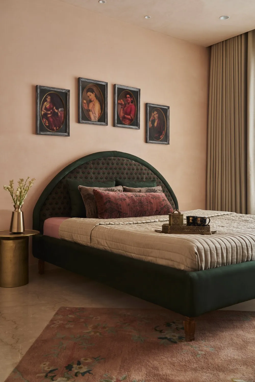 Designed as the client’s daughter envisioned, her room is rooted in Indian elegance, brought to life through a bespoke green dresser, Sabyasachi velvet upholstery, brass accents, wall pillars, and a delicate chandelier. A curved velvet headboard, English rose–textured walls, Ravi Varma art reproductions, and layered soft furnishings create a richly detailed, romantic space.