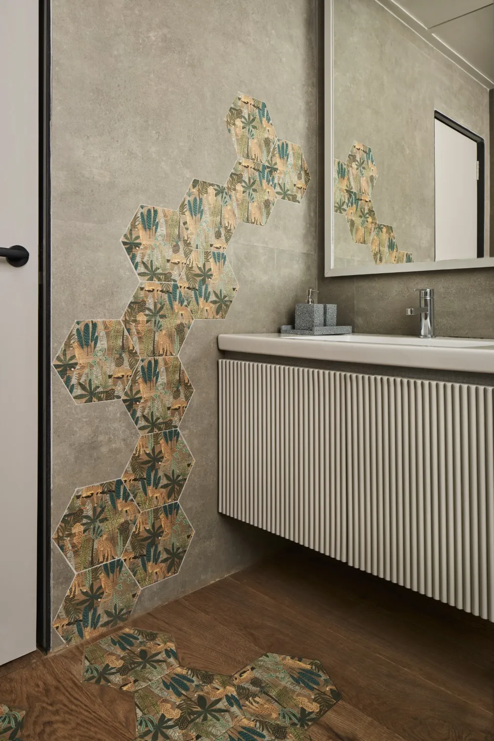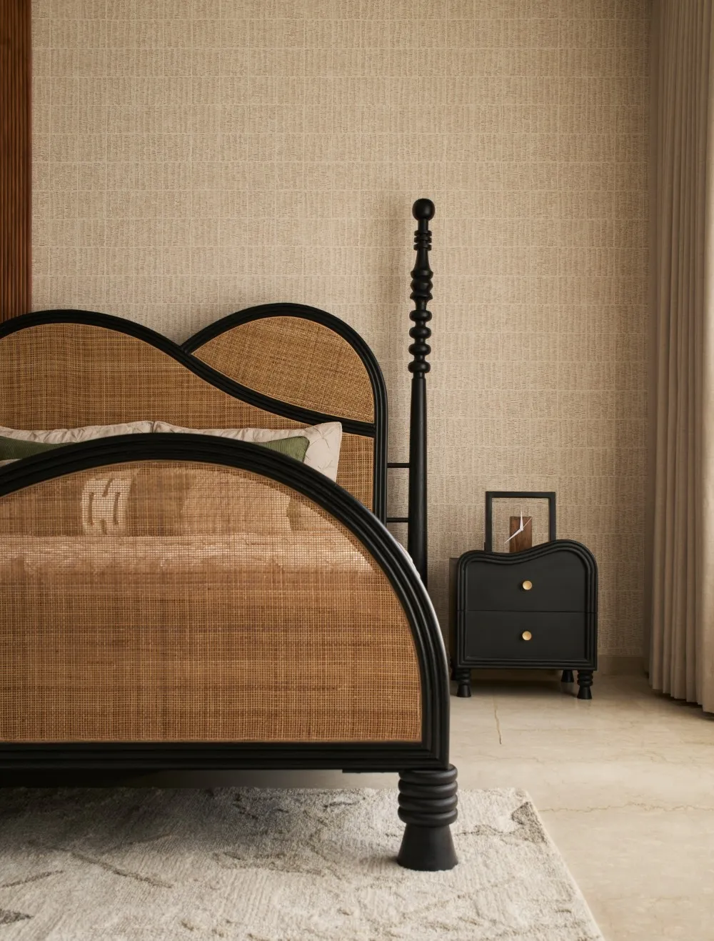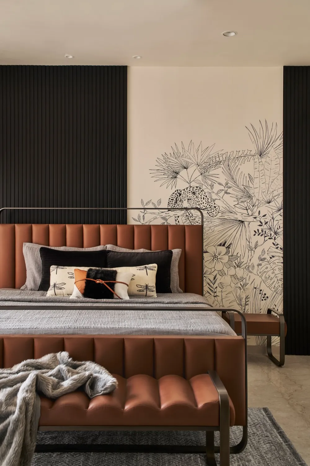 The master bedroom sets the tone with striking wallpaper and an equally statement-worthy custom bed, creating a room that feels bold yet beautifully balanced.