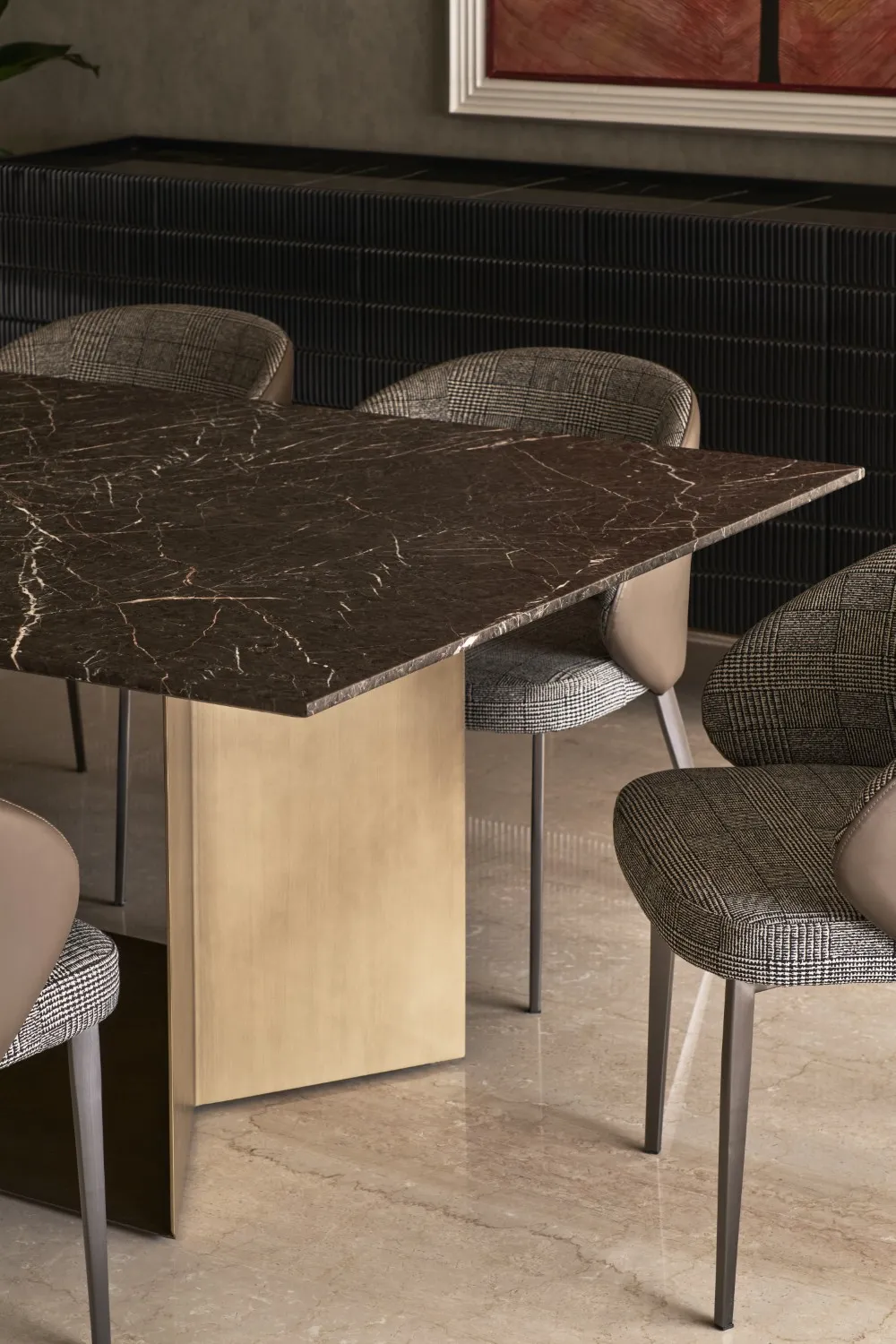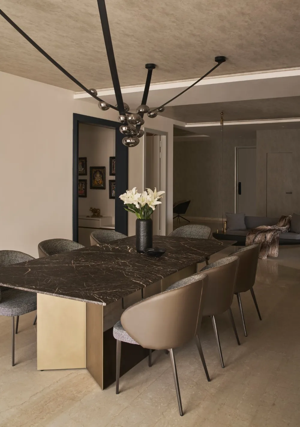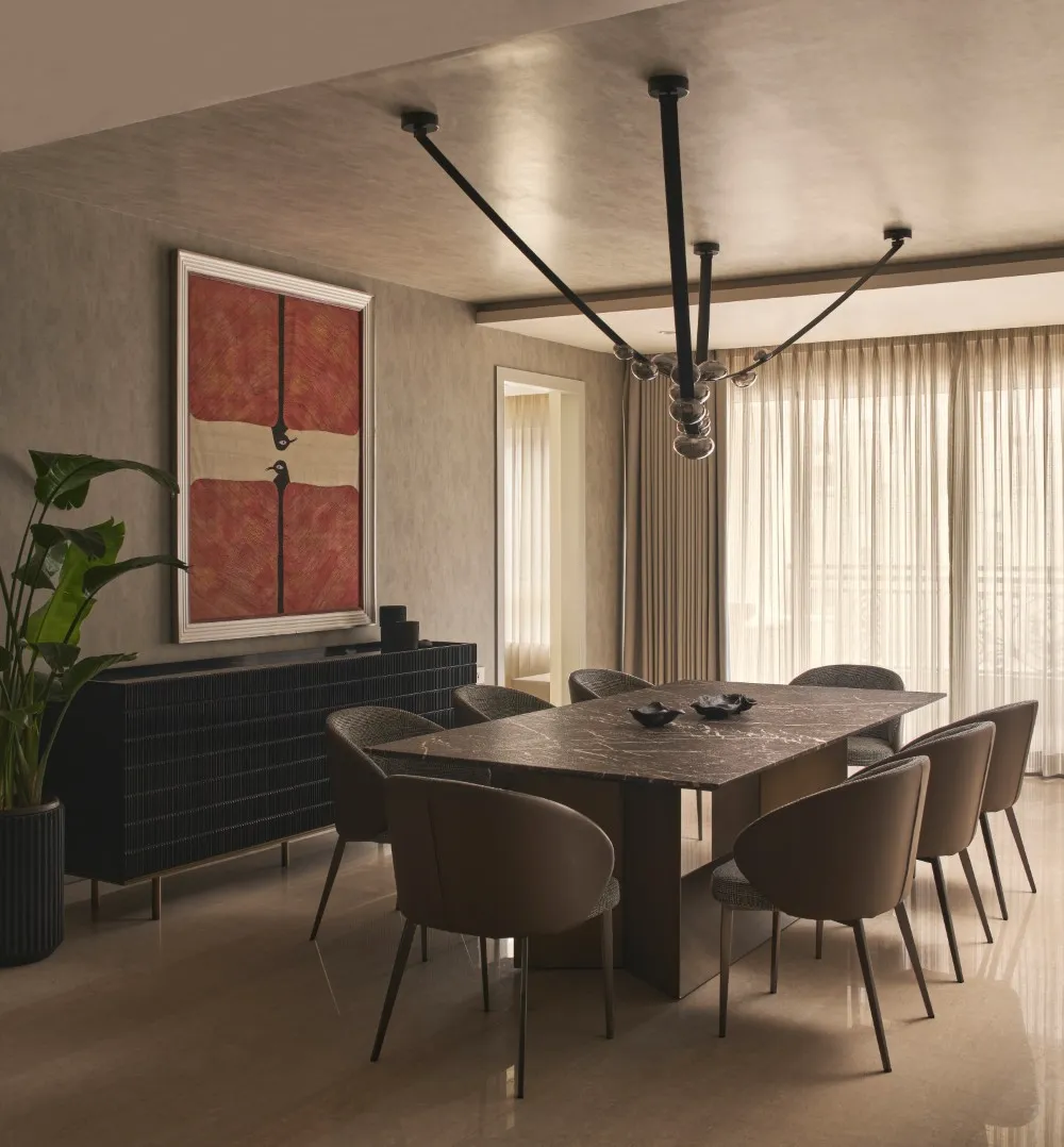The dining area is anchored by a textured marble-top table paired with leather and fabric chairs. Complementary lighting and vibrant wall art add depth and colour, completing this thoughtfully designed home that continues to age beautifully.