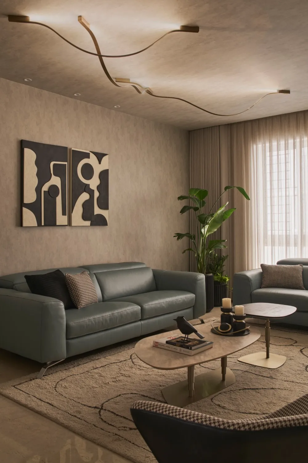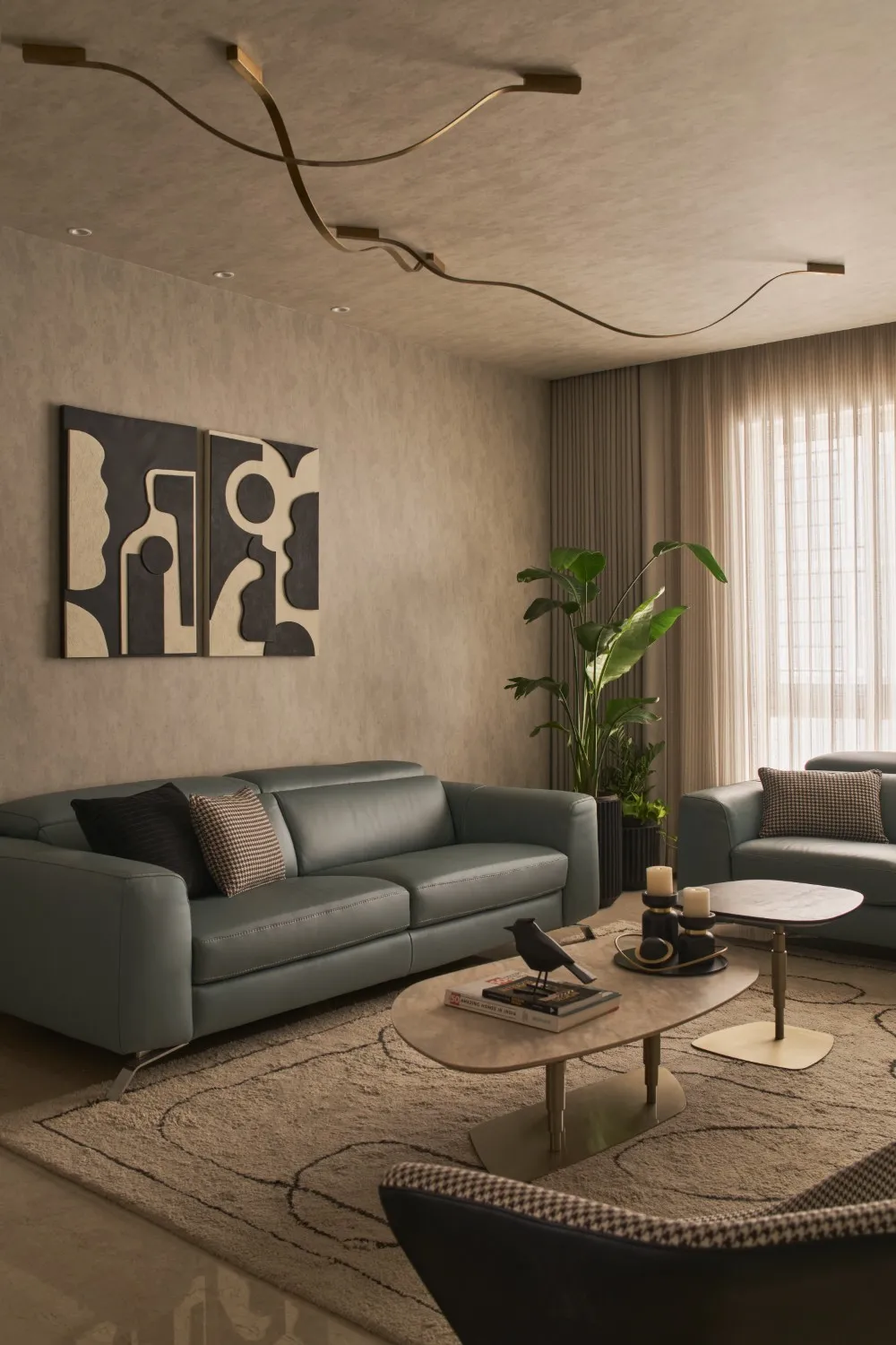 In the drawing room, comfort meets understated luxury. Pale blue leather recliners, classic black-and white accents, a houndstooth accent chair, indoor greenery, marble-top coffee tables, and statement ceiling lights come together to create a relaxed yet polished setting.