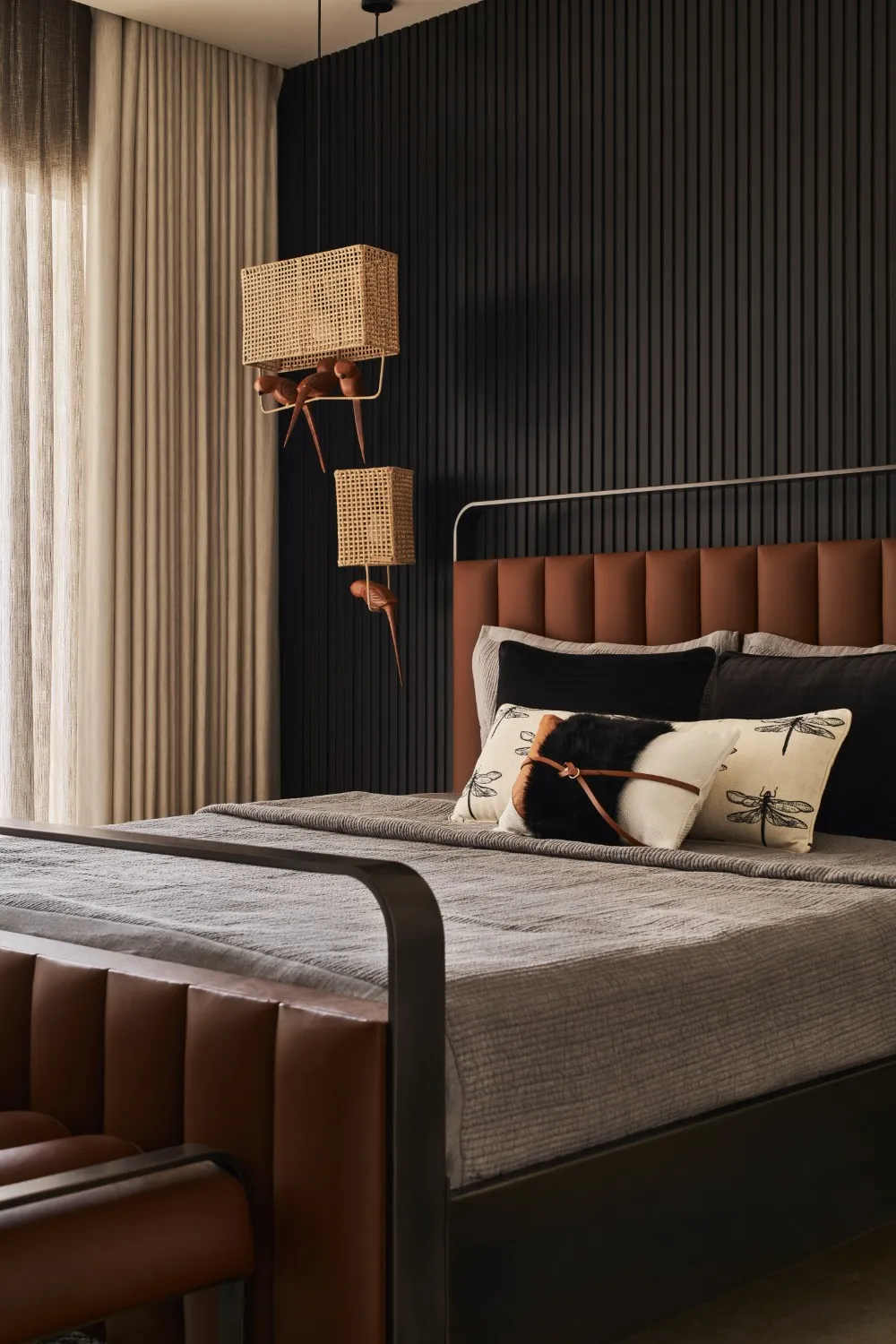 The guest bedroom plays with contrast—bold black-and-white wallpaper and black paneling softened by a tan bed and bench. Carefully chosen lighting, textiles, and accessories complete the look with warmth and character.